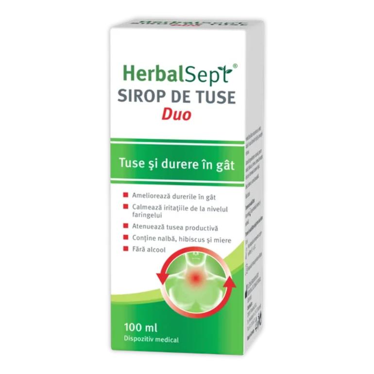 HerbalSept Duo sirop – sirop de tuse cu actiune dubla. Calmeaza tusea productiva, atenueaza durerea in gat. Prin intermediul extractelor naturale din plante de calitate superioara – nalba, hibiscus si miere – siropul.